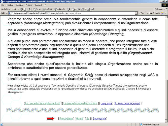 Fig. INFO6 Barra di fondo pagina secondo livello (avanti, indietro, su, home page) L'Home page fa eccezione, infatti, oltre alle barre di comando standard precedentemente descritte, è stata inserita una barra che consente di accedere direttamente alle pagine principali contenenti le informazioni generali ed i downloads. Per consultare il sito, come se fosse un libro, si consiglia di accedere all'argomento "organizzazione" dall'home page e di procedere dall'alto in basso e da sinistra a destra per tramite del comando successiva. Quando i sottoargomenti componenti un argomento sono terminati, la barra di sequenza (Fig. INFO4), esclude automaticamente il comando "successiva" e presenta il comando"su". Una volta raggiunto, con tale comando, il livello superiore viene riabilitato il comando "successiva" che consente di consultare, se presenti, la pagina seguente e con i comandi, posti sotto il titolo di testata, gli argomenti sottostanti. Attraverso tale modalità di navigazione sequenziale top-down (dall'alto in basso e da sinistra a destra) si consulteranno, per primi, gli argomenti classici, le teorie organizzative, gli approcci più utilizzati e quelli più attuali, per poi affrontare, anche se sommariamente, i mondi della complessità e della biogenetica, argomenti di base necessari per poter comprendere i concetti della genetica d'impresa (Corporate Genetics), oggetto della successiva fase di lettura. |